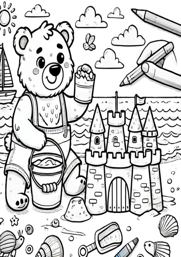 Однажды медвежонок отправился на пляж вместе со своей семьей. Он был очень весел и полон энергии, поэтому решил построить замок из песка. Мишка начал собирать песок и лепить из него крепкие стены замка. Он так увлекся процессом строительства, что не заметил, как прошло несколько часов.