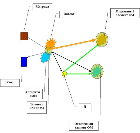 Разумеется, точки соприкосновения «имени» и «образа» могут меняться. Тот же близкий человек даже после очень бурной ссоры может вновь повернуться к нам привычной стороной — мы снимаем с него «заклятие» имени «враг» и накладываем другое «заклятие» — имени «любимый». В результате полностью меняется и восприятие близкого человека, и алгоритмы взаимодействия с ним, Матрица агрессивности сменяется Матрицей сексуальности, а сексуальная энергия и становится той жертвой, которая питает «светящийся шар» и связывающий нас Узор.