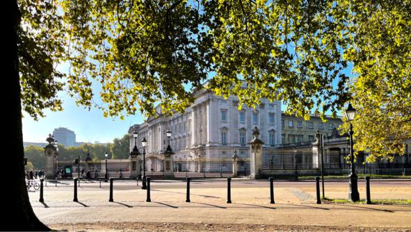 Вышли мы около входа в Грин парк. Для несведущих скажу, что это парк примыкает к Букингемскому дворцу. Парк, как парк — ухоженные газоны, деревья, дорожки для лошадей, людей и велосипедистов. Я что-то сфотографировал, потом посмотрел и понял, что в кадре ничего интересного нет. У дворца стояла толпа туристов. Экскурсоводы с флагами на палках водили группы и непрерывно что-то рассказывали. Сам дворец довольно скромный — серенький, с колоннами, тремя портиками и балясинами на крыше.