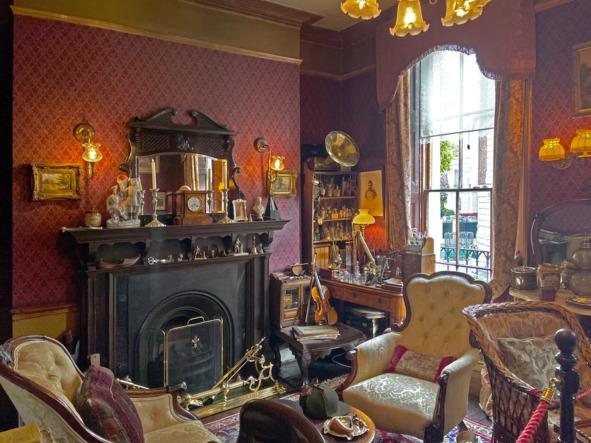 В гостиной, где Холмс принимал посетителей, курил трубку, играл на скрипке и проводил химические опыты, столько всяких вещей, что за пять минут, отведенных на эту комнату, не успеваешь увидеть и четвертую часть. Скрипка, стол с химической посудой, трубка, справочники, у камина два кресла, между ними столик с пепельницей, кепка сыщика и шляпа доктора Уотсона, лупа, на стенах картины, на каминной полке безделушки, на одной из полок граммофон — не помню, слушали ли Холмс с Уотсоном музыку? Много всего. Со мной ходили туристы из Японии, которые старались сделать фотографии всех членов группы на фоне вещей Холмса. В общем, комнату пришлось смотреть на фоне толкотни японцев и бубнения экскурсовода, который пытался рассказать о нравах и быте Викторианской Англии.