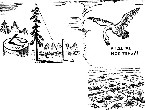 Что интересного можно найти в тенях, отбрасываемых предметами при сиянии солнца? Помощью теней прежде всего очень просто определить высоту одиноко стоящего дерева. Втыкают отвесно в землю шест, измеряют его высоту и длину его тени, а также длину тени, отбрасываемой деревом. Остается произвести расчет по правилу: во сколько раз тень дерева длиннее тени шеста, во столько же раз дерево выше шеста.