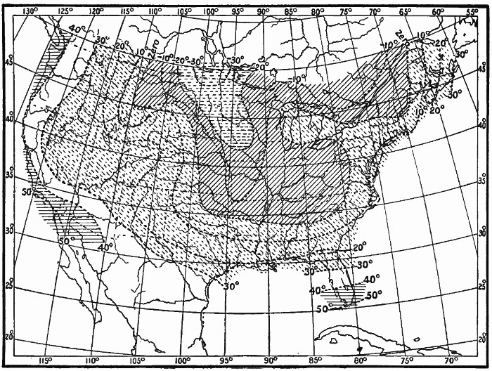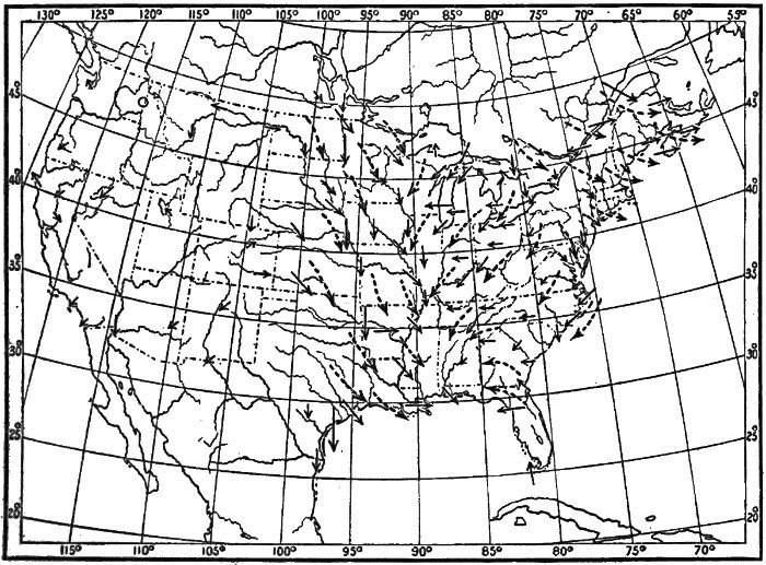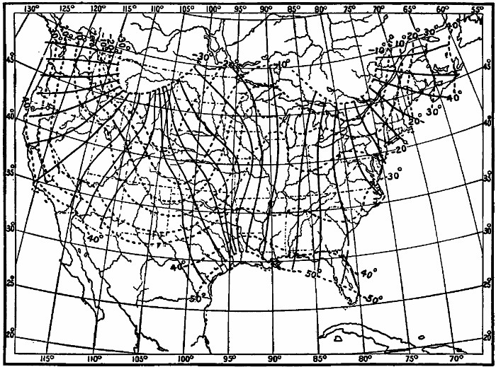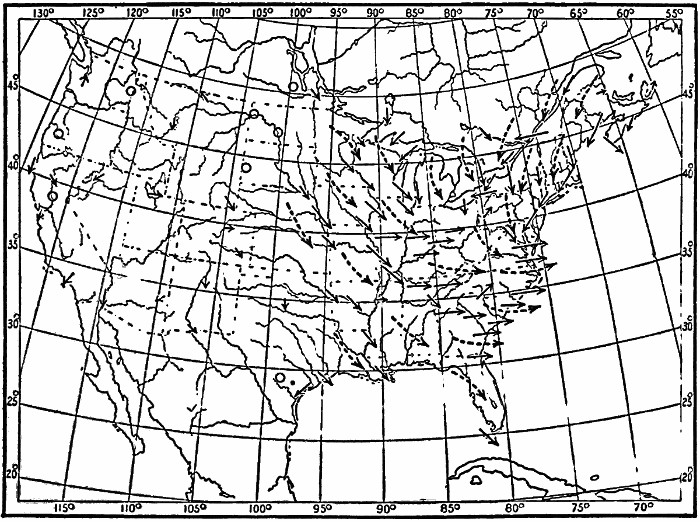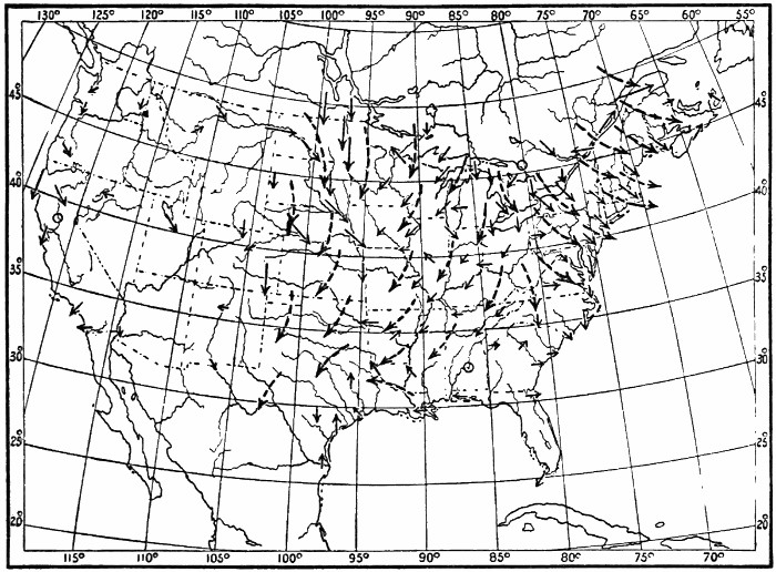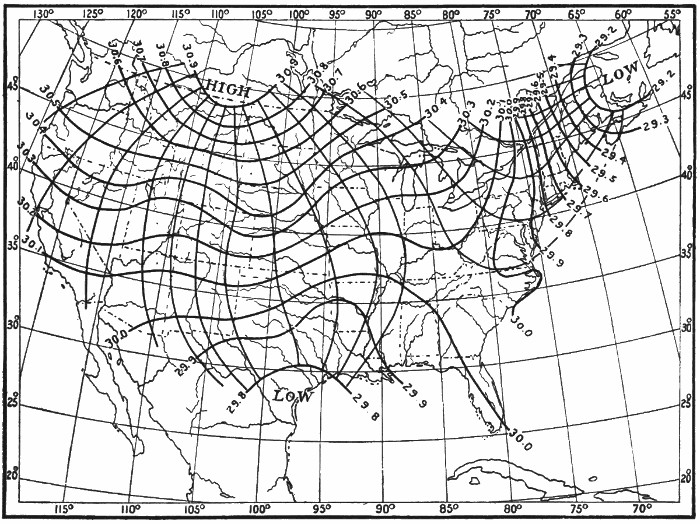 These observations are not made on land only. Hundreds of ship captains on all the oceans of the world are making their regular daily meteorological records, which at the end of the voyage are sent to some central office,[1] where they are studied and employed in the preparation of Pilot Charts for the use of mariners. By means of these ocean meteorological observations, which were first systematized and carried out on a large scale under the direction of Lieutenant Matthew Fontaine Maury (born, 1806; died, 1873), of the United States Navy, it has become possible to lay out the most favorable sailing routes for vessels engaged in commerce in all parts of the world.