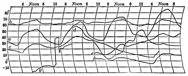 Temperature.—In keeping a record[2] of temperature without the use of a thermometer, excellent practice is given in observations of the temperature actually felt by the human body. Our bodies are not thermometers. They do not indicate, by our sensations of heat or cold, just what is the temperature of the surrounding air, but they try to adjust themselves to the conditions in which they are. This adjustment depends on many things beside the temperature of the air; e.g., the moisture or humidity of the air; the movement of the air; the temperature and the nearness of surrounding objects. In summer, a day on which the temperature reaches 80° or 85° often seems much hotter than another day on which the temperature rises to 95°. In winter, temperatures registered by the thermometer as 10° or 15° above zero often feel a great deal colder than temperatures of -5° or -10°. In recording your observations on temperature, the record book may be divided into columns as follows:—