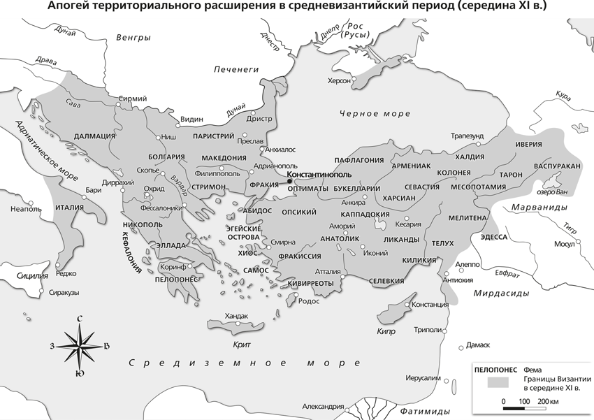 Некоторое время спустя само существование восточного фланга империи оказалось под натиском арабов. Византия в считаные годы потеряла две самые процветающие провинции — Египет и Сирию. Арабская угроза сохранялась как на суше, так и на море вплоть до IX в., а Константинополь оставался для арабов желанной целью даже после знаменитой осады 717–718 гг. Затем наступил период византийской «реконкисты»: сначала империя отвоевывала земли у багдадских Аббасидов, потом, с 970-х гг., у каирских Фатимидов и одновременно — у Болгарского царства. Болгарию можно без преувеличения назвать второй империей на Балканах: наивысшей точкой расцвета было правление в начале X в. царя Симеона, выросшего в Константинополе. В первой половине XI в. Византия вновь достигает территориального максимума, связанного с правителями из так называемой Македонской династии (867–1056), точнее, после присоединения болгарских территорий Василием II, экспансионистская политика которого к тому времени позволила захватить север Сирии и Месопотамии, а в планах стояло постепенное вторжение на Кавказ.