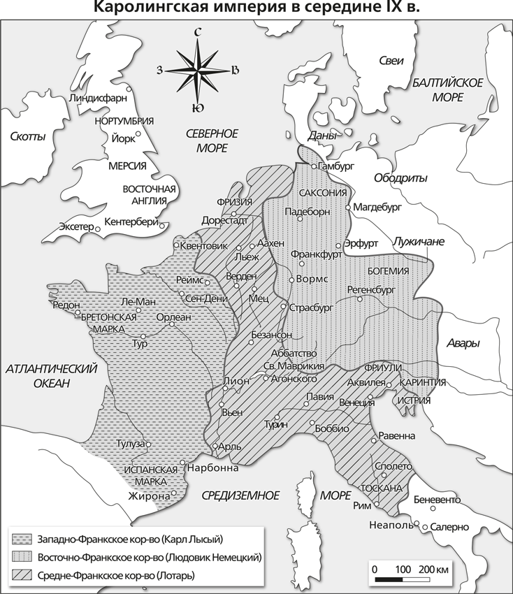 Каролингская империя появилась в 800 г., когда папа Лев III короновал Карла Великого в Риме. Ее возникновение стало логичным продолжением политики его деда Карла Мартелла и отца Пипина, пришедших к власти на закате меровингской эпохи. Пипин получал королевский венец дважды — в 751 и 754 гг.; в 768 г. ему наследовал Карл. Он укрепил власть, полученную в наследство от отца, и начал проводить активную захватническую политику, вскоре подчинив Баварию и Саксонию. На севере Италии он увенчал себя «железной короной» лангобардских королей, тем не менее не присоединяя их земли к территориям франков, захватил герцогство Сполето, а на юге полуострова обложил данью княжество Беневенто. По сути Карл управлял империей еще до того, как получил соответствующий титул. В 814 г. он скончался, а власть перешла к его сыну Людовику Благочестивому. Людовик столкнулся с враждебностью собственных сыновей: после череды восстаний и войн в 843 г. по Верденскому договору империя была поделена между ними на три части (Карл Лысый получил Западно-Франкское королевство, Людовик Немецкий — Восточно-Франкское, а Лотарь — Лотарингию). Раздел не означал распада империи: императорский титул перешел к Лотарю, контролировавшему две столицы — Ахен и Рим. Однако новые кризисы и междоусобицы вскоре уничтожили империю. После смерти Карла Толстого в 888 г. каждое королевство пошло по своему собственному пути.