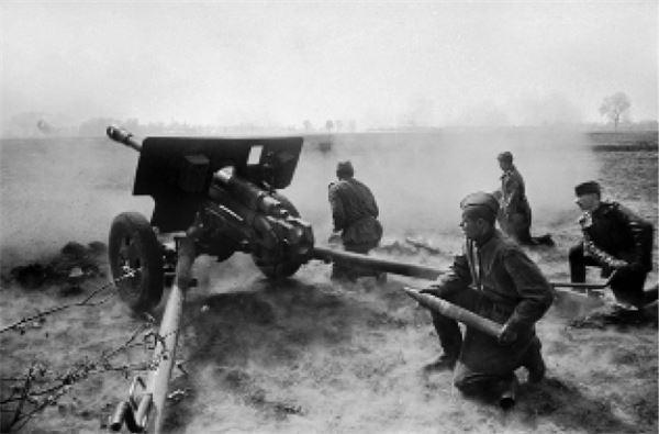 Орудийный расчет ведет бой на окраине города. 1-й Белорусский фронт
