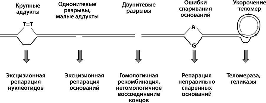 Рис. 2. Виды повреждений ДНК и их репарации.