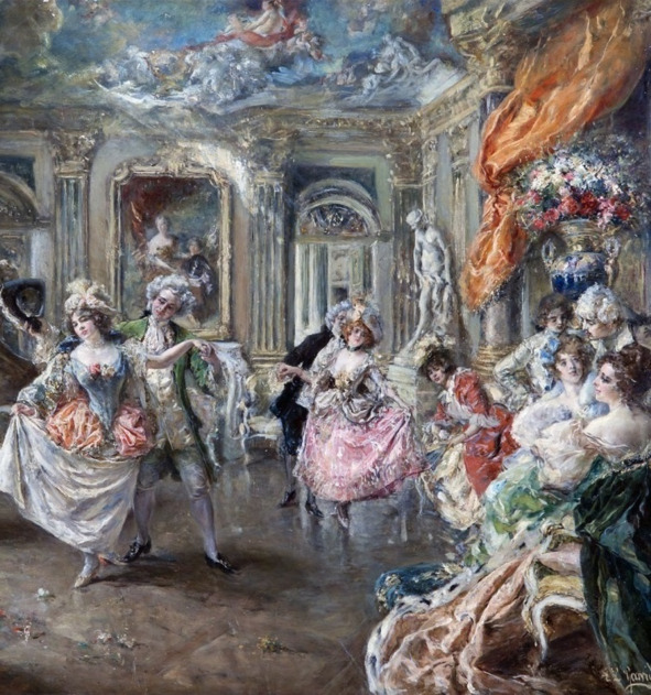 Но, чтобы не оплошать, все кавалеры срочно поспешили приглашать на танец дам и барышень, а нарумяненные и напомаженные дамы и барышни, наперебой принялись подпрыгивать и приседать в книксенах перед своими напудренными кавалерами.