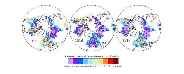 Россия (Российская Империя). Три разорительных и тяжелейших года для стран Европы, Северной Америки и Азии на территории России прошли удивительно мягко — ни власти, ни население страны попросту ничего не заметили. Даже наоборот, все три года — 1816-й, 1817-й и 1818-й — лето в России прошло гораздо лучше, чем в иные годы. Тёплая, умеренно сухая погода способствовала хорошим урожаям зерновых, наперебой закупаемым бедствующими государствами Европы и Северной Америки. Похолодание европейских морей наряду с возможной переменой направления течения Гольфстрим только улучшило климатические условия в России.