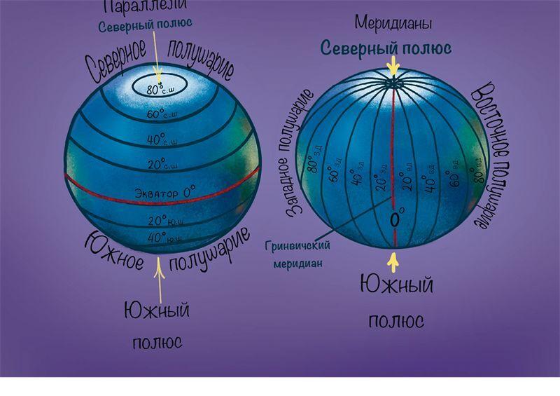 Представьте апельсин. Если мы его разрежем на кружочки, то поймём, как выглядят широты. Если мы очистим апельсин от кожуры и разделим его на дольки, то поймём, как выглядят меридианы.