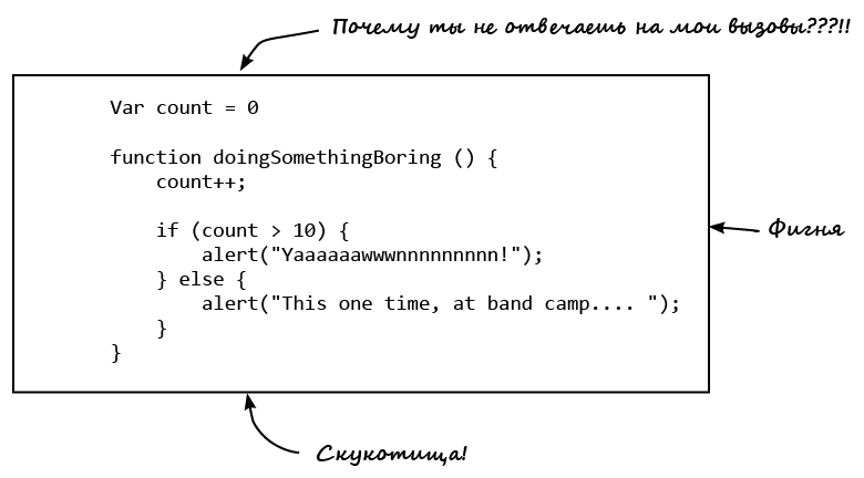 Если быть более точным, слово alert — это то, что часто называют функцией. Вы будете использовать функции повсеместно. По своей сути они являются фрагментами переиспользуемого кода, который что-то делает. Это «что-то» может определяться вами, сторонней библиотекой или же самим фреймворком JavaScript. В нашем случае код, который дает функции alert магическую способность отображать диалоговое окно с переданным в нее сообщением, существует в глубинах браузера. Все, что вам на самом деле нужно знать, так это то, что для использования функции alert ее нужно просто вызвать и передать ей сообщение для отображения. Все остальное будет сделано за вас.