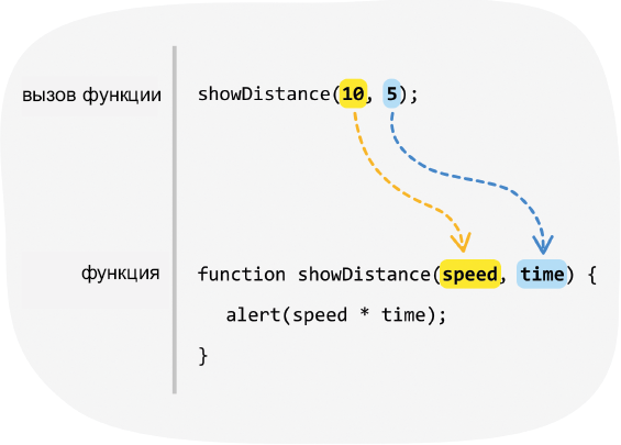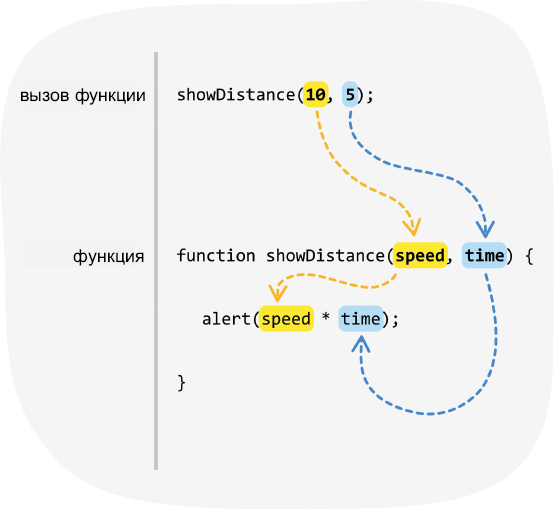 Для вызова в функцию showDistance передается 10 как аргумент для speed и 5 — для time. Изображенный на диаграмме перенос полностью основан на последовательности.
