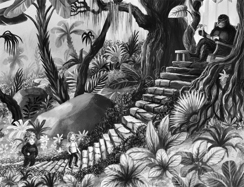 Бабушка джунглей указала на высокую массивную изгородь в конце лестницы. Изгородь, как палисад вокруг крепости, тянулась в обе стороны: толстые колья высотой метра в четыре, вбитые в землю вплотную друг к другу и разукрашенные во всевозможные цвета. Но Паула смотрела не на гигантский забор, а на гориллу, сидевшую перед ним. Большую красивую чёрную гориллу, которая устроилась на деревянном стуле, закинув ногу на ногу с книгой в одной руке и стаканом с трубочкой – в другой. Заметив Бабушку джунглей и Паулу, горилла отложила книгу на столик рядом, отпила через трубочку, поставила стакан и встала.