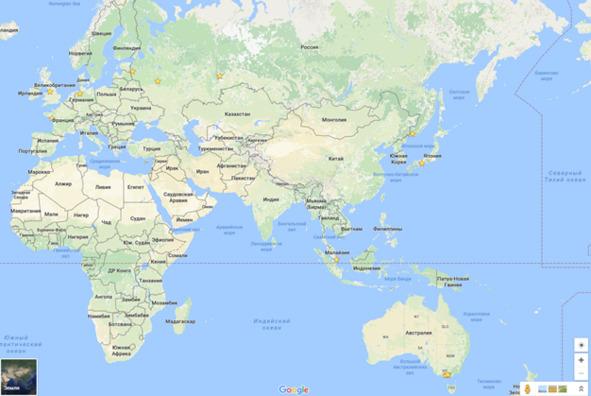 Рисунок 1. Карта сенсорных садов мира (Евразия)