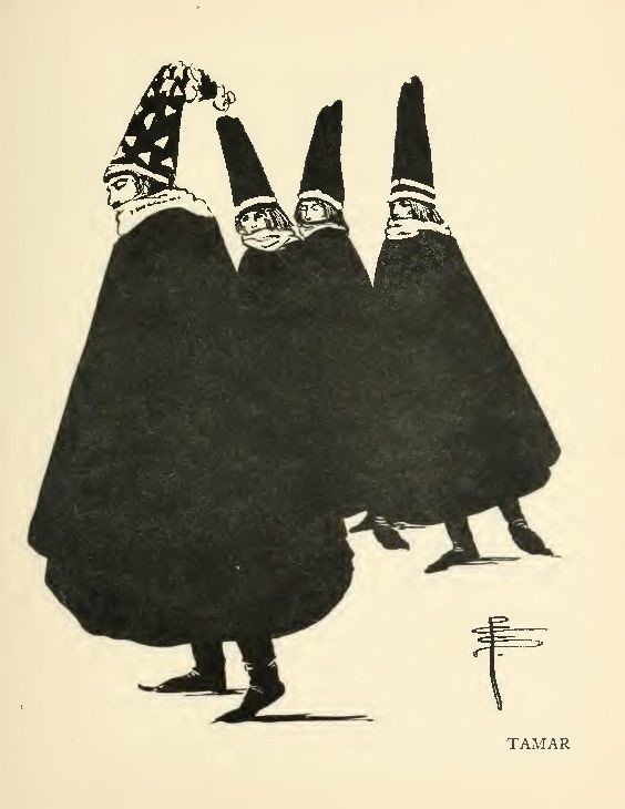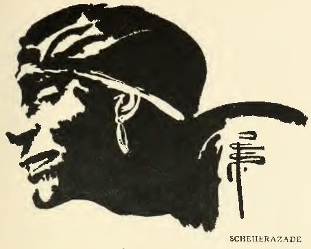 TAMAR" is another pleasant little ballet of barbarity, in which Karsavina, as one of those avid, fatal heroines, in the interpretation of whose serpentine passions she is always fine, lures lovers to her high tower, and, in the manner of the Chinese Empress, makes death the penalty of an hour of her love. The execution is summary, the unfortunate lover being hurled out of the window by muscular members of Tamar's suite. In "Tamar" Adolph Bolm, who was I think the first Russian male dancer to appear in England, makes a magnificent entrance. Miss Pamela Colman Smith's drawing gives a very vivid impression of the effect produced by the first appearance on the scene of the Lover and his companions. Here is a very good example of the amazing influence that the color and shape of mere garments can have on the imagination. Those silent, black-coated, black-hatted men, their faces muffled in concealing scarfs, seem to have come from far, from very far. I feel that their horses below are in a sweat, that they have been riding furiously at the summons of a force which their fresh and ardent youth could not resist!