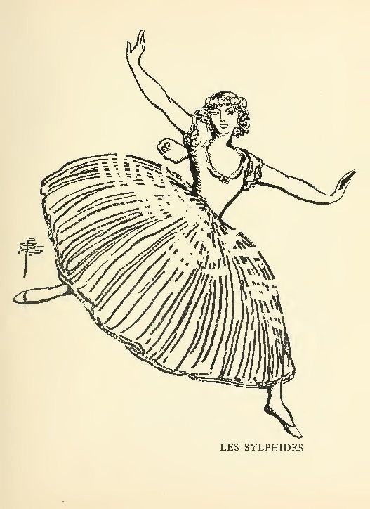 Perhaps the rhythm of the music has never been better perceived than through these well-ordered movements designed by Fokine. The appearance of Nijinsky as a kind of dream Alfred de Musset in a romantic fair wig, and dressed in black and white, among the impalpable Sylphides was both inexplicable and inevitable. When he danced he seemed almost to play Chopin with his feet, so perfect was his time. His steps seemed to be the symmetry of the music—in fact its rhythm, for the rhythm of music is symmetry in motion. And when he merely walked about with outstretched arm, he recalled Ruskin's allusion to man "in erect and thoughtful motion," to "the great human noblesse of walking on feet."
