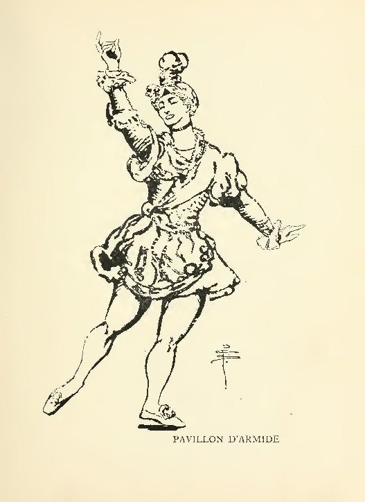 IN this ballet, in the style of the French ballets of the reign of Louis XIV., there is less distinction, I think, than in the others from which Miss Pamela Colman Smith has derived her pictures. The costumes and scenery are "designed by Benois," but any one with a knowledge of the theatre and a Racinet at hand could have done the same sort of thing. And yet as I write this I know I should make the reservation of that "life" which the Russians know how to breathe into everything. What I mean is that Benois gives us no new creation. Karsavina's bird-like grace in her eighteenth-century guise is captivating (oh, that this talented little dancer had more music in her, and did not dance always a fraction off the beat!), and Nijinsky as a wholly unnecessary slave in white satin gives a wonderful exhibition of dancing in the style of the original Ballon who danced at the opera in Paris at the end of the seventeenth century, and gave his name to the kind of classical dancing which consists in elevation.