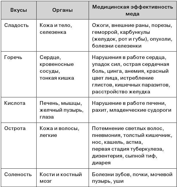 Сладость стимулирует функцию желудка и селезенки, помогает сердцу и печени. Она также питает легкие, кожу и волосы. Кроме того, сладость обладает функциями ослабления и смягчения мышц и неврогенной боли. Мед должен быть в каждом доме как средство первой помощи.