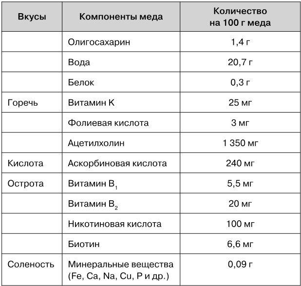 Сахара и ферменты предназначены для селезенки и желудка, витамины группы B – для легких, кожи и волос, минеральные вещества – для почек, костей и костного мозга, органические кислоты и витамин C – для печени и желчного пузыря, витамин K, фолиевая кислота и ацетилхолин – для кровеносной системы и сердца. Это является основой научного понимания функции меда с точки зрения восточной медицины.