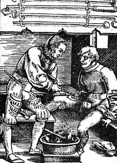 (Рисунок из книги «Полевая хирургия» Г. Герсдорффа. 1517 г.)