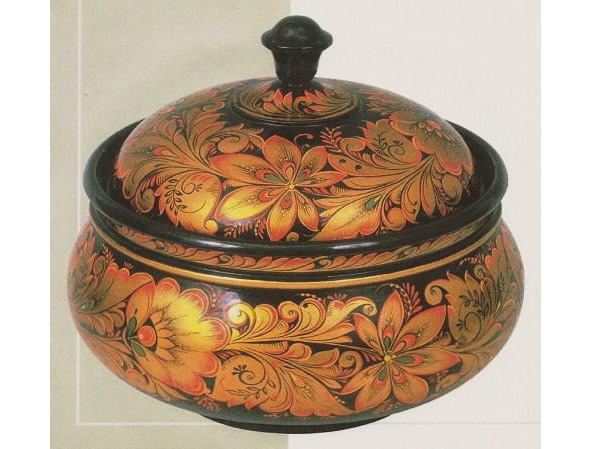 Эта роспись открывает нам тайну поэтического (символического) мышления автора. Самобытный стиль мастера очень выразителен, и вместе с тем мягок, полон нежности и золотистой неги. От ритма орнамента исходит гениальная ясность и простота, характерная для народных сказаний и былин. С ювелирной точностью прорисованы детали, мастерски передана удивительная геометрия живой природы!.. Здесь автор отдаёт дань своему пристрастию к декоративности. Нашлось место и для импровизации кистевого письма, – смелого и свободного «дыхания» узора», и, в то же время, тихого, вдумчивого, нежного чувства, переданного в мотивах былинного цветка «горицвета». С ювелирной тщательностью прорисованы детали, ни одного огреха или помарки, или неуклюжего поворота кисти, – словно к узору не прикасалась человеческая рука, а он сам явился к нам каким-то волшебным мановением ока!.. Форма изделия и роспись сошлись с такой прицельной точностью, как стыкуются в космосе орбитальные космические станции! Никому другому это уже не повторить – оно глубоко индивидуально.