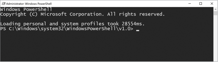 Мигающий курсор означает, что PowerShell готов принимать от вас команды. Обратите внимание, что ваша строка — приглашение ввода, начинающаяся с PS, вероятно, будет отличаться от моей, так как в ней указано ваше текущее местоположение в системе. Как видно из заголовка моей консоли, я щелкнул по значку PowerShell правой кнопкой мыши и запустил его от имени администратора. Это дает мне полные права, а запуск происходит в каталоге C:\Windows\system32\WindowsPowerShell\v1.0.