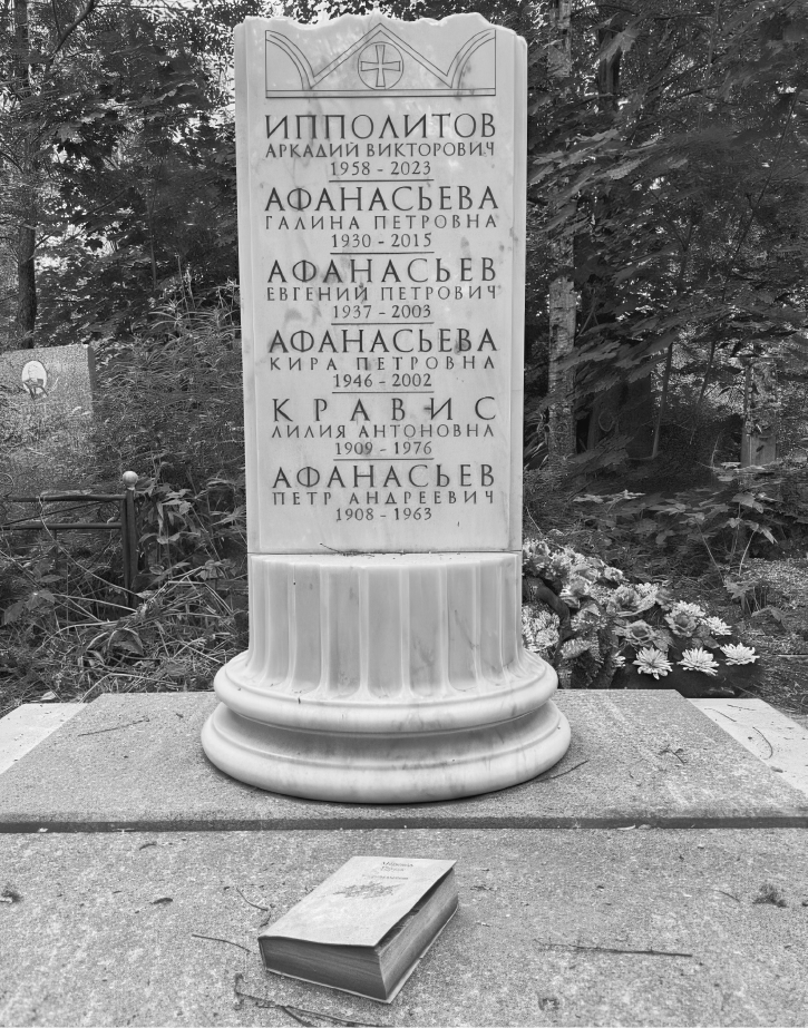 На его могильной плите лежит мраморный том Марселя Пруста «В поисках утраченного времени». Любимый роман, над которым возвышается мраморная римская колонна. Она будто рассечена напополам то ли временем, то ли пронесшейся бурей (архитектор Максим Атаянц). Колонна как воплощение идеального порядка вечности. Среди множества других надгробий, расположенных рядом в обычной кладбищенской тесноте, этот небольшой памятник на Новом Волковском кладбище выделяется своей классической строгостью.