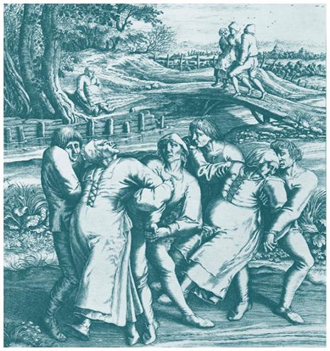 На гравюре Гендрика Гондиуса (1573–1650) изображены три женщины, пораженные танцевальной чумой («Пляска святого Витта»).