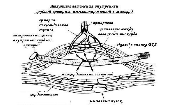 Смысл операции Вайнберга заключался в имплантации специально подготовленного трансплантата внутренней грудной или, как ее еще называют, маммарной артерии в тоннель, сформированный в миокарде. Перед имплантацией свободный конец артерии перевязывался, а мелкие боковые веточки, напротив, оставлялись нелигированными (рис. 3).