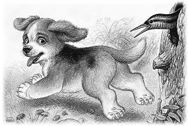 Подбежал к дереву и видит: сидит на ветке маленькая птица Вертишейка. Кинулся к ней, а Вертишейка юрк в дупло. «Ага! – думает Щенок. – Попалась!» Поднялся на задние лапы, заглянул в дупло, а в чёрном дупле чёрная змея извивается и страшно шипит. Отшатнулся Щенок, шерсть дыбом поднял – и наутёк.