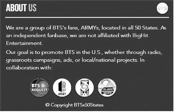 Описание на сайте фанатского объединения 50 американских штатов BTS×50states. Текст на фото: «Мы – ARMY, группа фанатов BTS, расположенная в 50 штатах. Как независимая фанбаза, мы не сотрудничаем с BigHit. Наша задача – рассказать о BTS на территории США посредством радио, рекламы и мероприятий на локальном и национальном уровне»