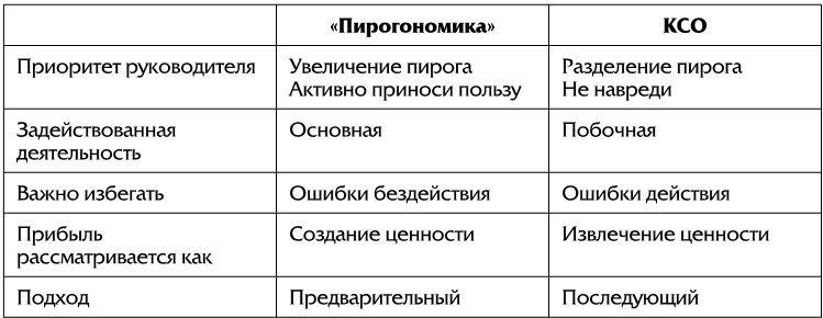 Разделением пирога занимаются не только инвесторы и руководители. Сотрудники могут сопротивляться нововведениям в рабочих процессах, которые могут негативно отразиться на жизнеспособности компании в долгосрочной перспективе. Если работа топ-менеджера хорошо оплачивается в результате создания ценности, но компания не участвует в программах утилизации мусора, клиенты могут бойкотировать продукцию фирмы. Увеличение пирога является в первую очередь обязанностью руководителя, но его невозможно осуществить без участия всех граждан. Мы вернемся к этому вопросу в главе 10.