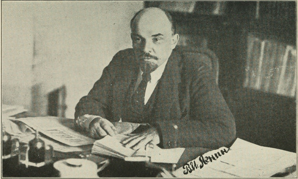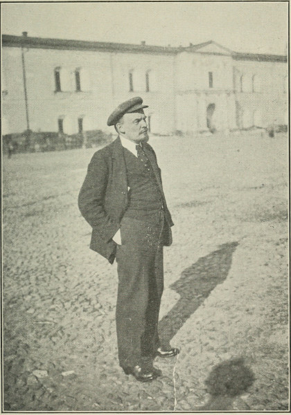 Lenin is a man of middle height, close to fifty years of age. He is well proportioned, and very active, physically, in spite of the fact that he carries in his body two bullets fired at him in August, 1918. His head is large, massive in outline, and is set close to his shoulders. His forehead is broad and high, his mouth large, the eyes wide apart and there appears in them at times a very infectious twinkle. His hair, pointed beard, and mustache, have a brown tinge. His face has wrinkles,—said by some to be wrinkles of humor,—but I am inclined to believe them the result of deep study, and of the suffering he endured through long years of exile and persecution. I would not minimize the contribution that his sense of humor has made to these lines and wrinkles, for no man who lacked a sense of humor could have overcome the obstacles he has met.