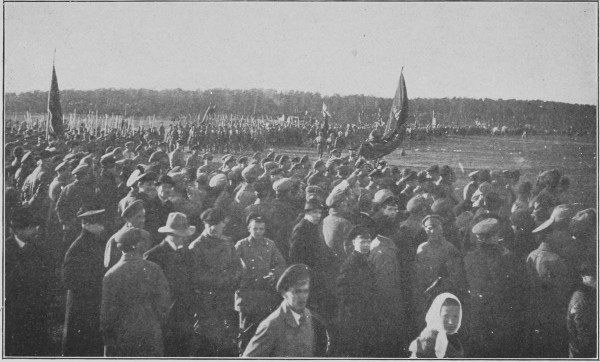 The preferential treatment of the soldiers, of which I had heard so much before I saw it and shared it, consists principally in maintaining an uninterrupted supply of black bread and tea. It may be propaganda, it may be a peculiar quality in the spiritual and physical composition of the Russian peasant. Whatever it is, I do not believe that any other European army would endure so long on a ration of black bread and tea. An occasional apple or cigarette were luxuries, all too quickly consumed and forgotten. The black bread and tea, constant and unvaried, will ever remain for me the symbol both of the efficiency of the Soviet Commissary and of the zeal of the Red soldier. Black bread and tea and song. Their love for song is amazing,—all songs, but principally the Internationale. They march off to the front singing, they limp back from battle singing, they sing on the trains, and in the barracks, and at mess; they sing while they are playing checkers and they sing while they are sweeping stables. They wake up at night and sing. I have heard them do it.