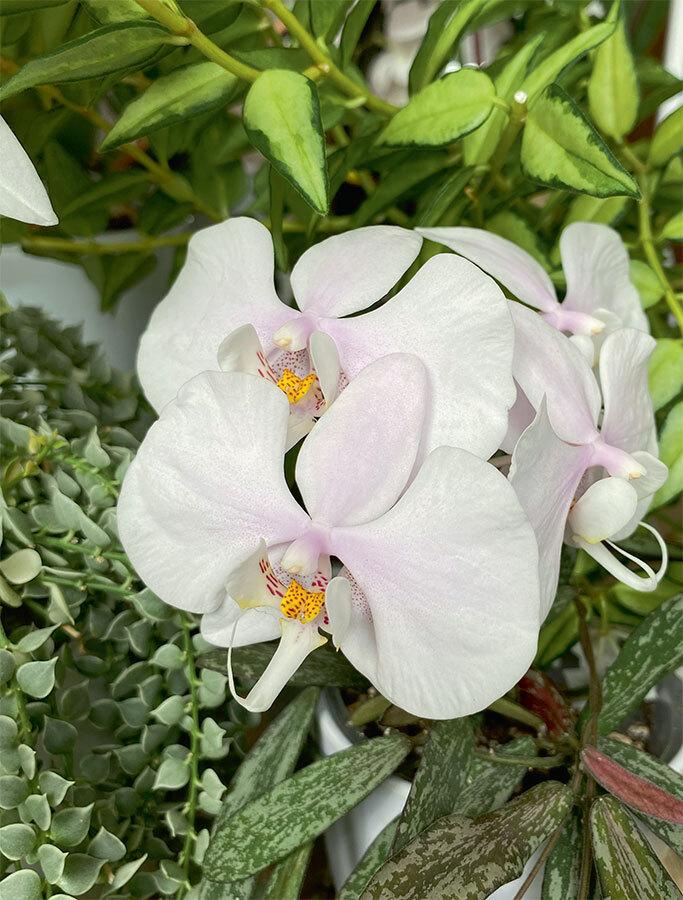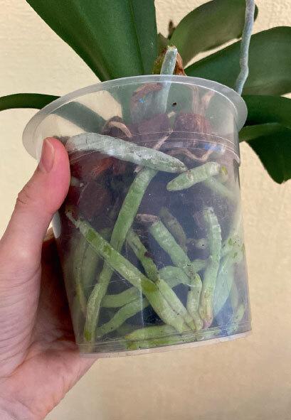 1. Фаленопсис цветет. В этот момент он не растит листья и корни. Мы говорим, что корни закуклены – нет зеленых или бордовых растущих кончиков.