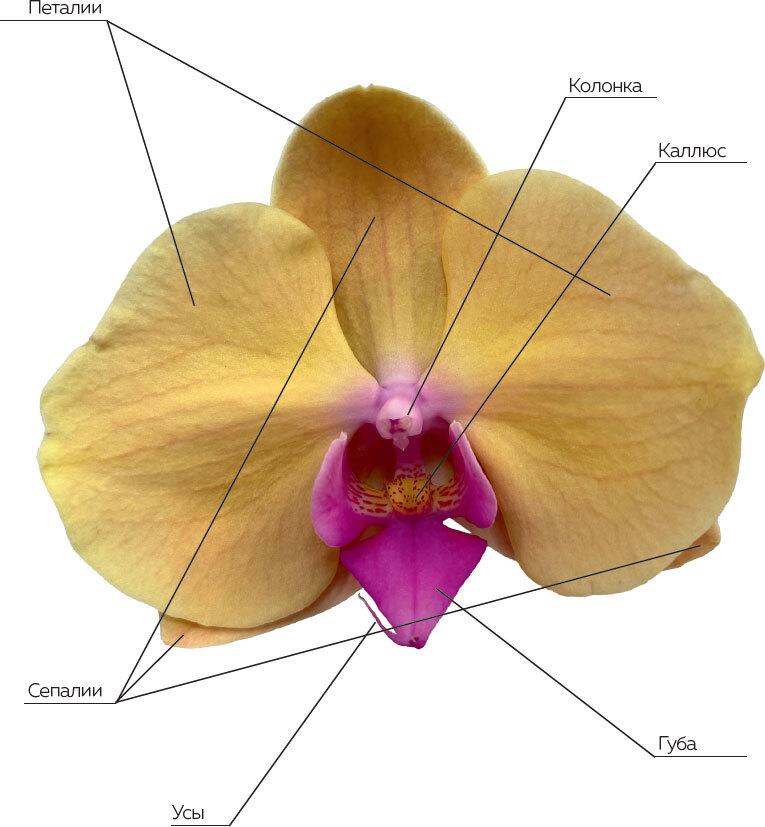 Типичный цветок фаленопсиса состоит из нескольких элементов: