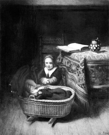 Этот сюжет виртуозно развивает один из учеников Рембрандта, Николас Мас (1634–1693), еще глубже проецируя его в повседневность. Маленькая девочка прилежно качает плетеную колыбель с грудничком, на столе раскрыта книга. Затем девочка взрослеет – и вот уже сама склоняется над спящим малышом, укрытым красным одеяльцем, как на картине Рембрандта. И кажется: у нее на коленях та самая книга, что когда-то лежала на столе с пестрой скатертью. Только тогда книга выглядела фантастически большой, а теперь смотрится соразмерно читательнице. Сжимая пружину времени, этот образ соединяет два эпизода в одну историю. Молодая мать не ведает, какая судьба уготована ее ребенку, – и в незатейливой бытовой сцене проступают контуры евангельского сюжета.