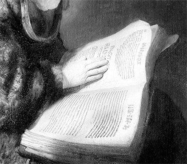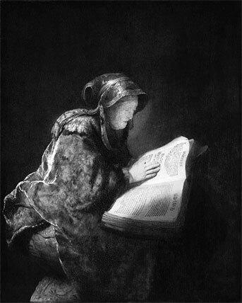 В хрестоматийном портрете пожилой женщины за чтением Библии яркий свет падает на книгу откуда-то сверху, будто с самих небес. Принято считать, что для этой картины позировала Нелтье – мать Рембрандта, которую он представил в образе пророчицы Анны, что служила Господу молитвой и узнала мессию в принесенном во храм младенце Иисусе. Впечатляют пластичность листаемых страниц, естественность изображения пергамена, непринужденность воспроизведения художником еврейских букв.