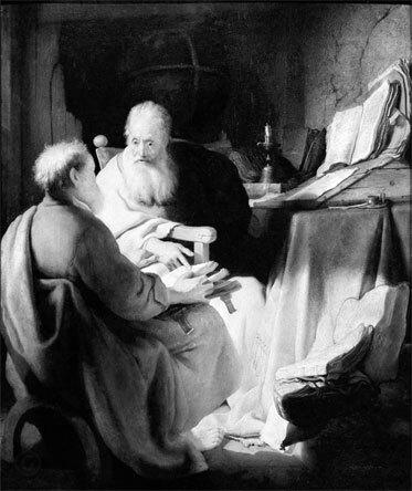 Опора на библейский – будь то ветхозаветный или евангельский – контекст придавала универсальные, вневременные смыслы даже обыденным вещам и повседневным ситуациям. Яркий пример – «Диспут двух ученых», написанный мастером в возрасте двадцати двух лет. Несмотря на нейтральное авторское название, на картине легко узнаваемы святые апостолы Петр и Павел. Предметом обсуждения, скорее всего, служат Послания Петра, которые он держит в руках. Петр внимает доводам оппонента, заложив пальцами страницы с фрагментами, о которых идет речь. Послания Павла разложены на столе как ожидающий своего часа «контраргумент». Апостола Павла с большой книгой – сообразно иконописному канону – можно видеть в других рембрандтовских работах.