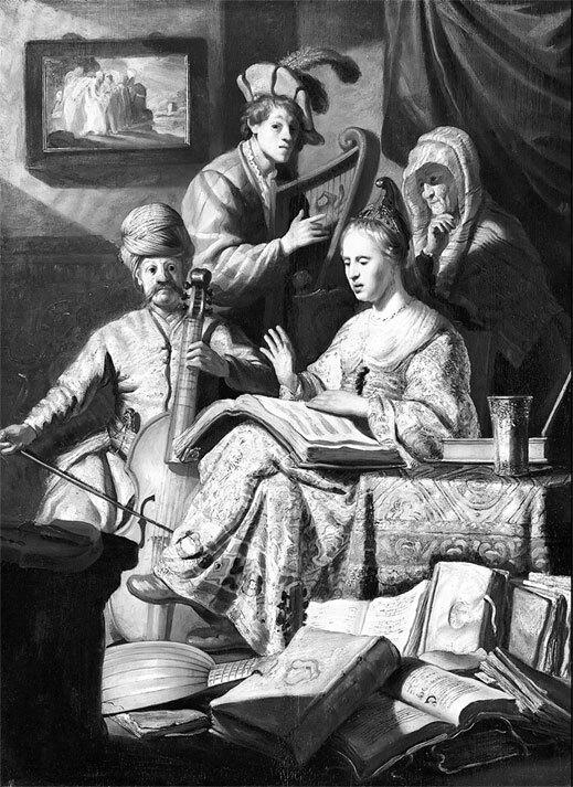 Книги присутствуют и в аллегорических работах Рембрандта. Вероятно, самый известный пример из раннего творчества – «Концерт», именуемый также «Аллегория музыки». Двое мужчин музицируют на арфе и виоле да гамба. Молодая женщина поет, глядя в нотный альбом. Прочитать написанное в нем невозможно – страницы заполнены условными мазками. Пожилая женщина внимает музыке и пению. На стене висит картина с сюжетом бегства Лота из Содома.