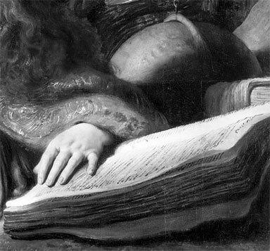 Светотень вертикально разделяет холст на две части, акцентируя особое место и высокий статус книг. Их созерцательная красота нерасторжима с глубиной содержания. Рембрандт изображает книгу чаще всего как яркое световое пятно в полумраке комнаты. В торжественном золотистом сиянии обнажается сама «душа» книги, материализуется ее бесплотная сущность. Всякая книга – негасимая лампада, светоч знания. Живая мысль и всевластное слово, торжественно проступающее из мрака невежества и безверия.