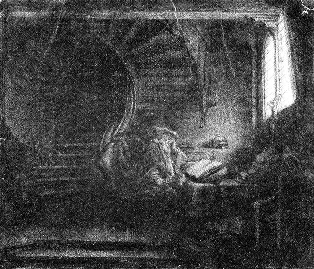 Рембрандт. Святой Иероним в темной комнате, 1642, офорт, сухая игла