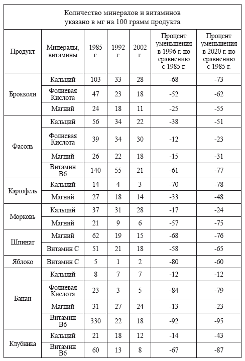 1) Резкое снижение процента витаминов и минералов в овощах и фруктах за последние десятилетия за счет обеднения почв, повышенных объемов потребления и применения теплиц, ускорителей роста созревания и обработки другими химическими веществами (пестициды, гербициды) (см. таблицу ниже).