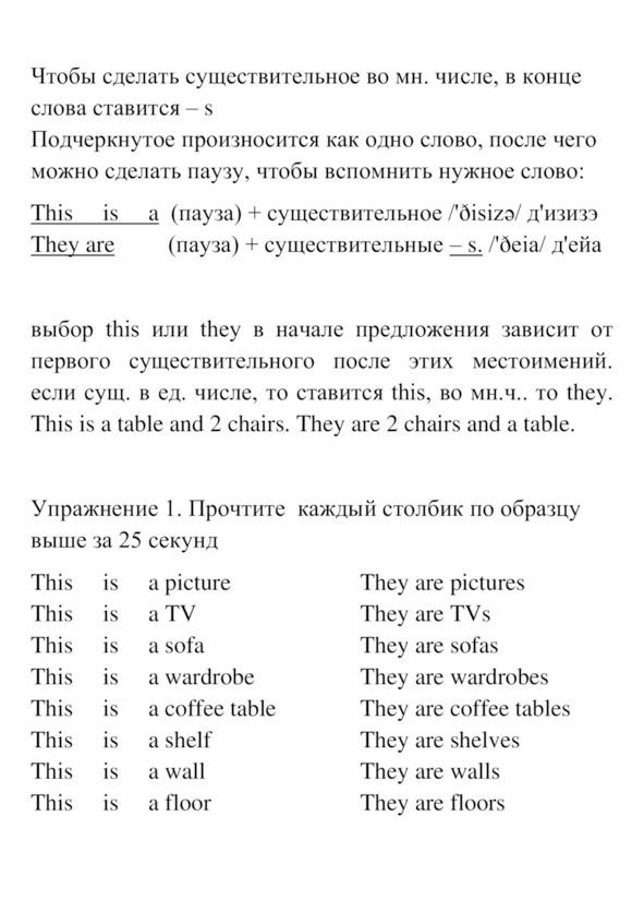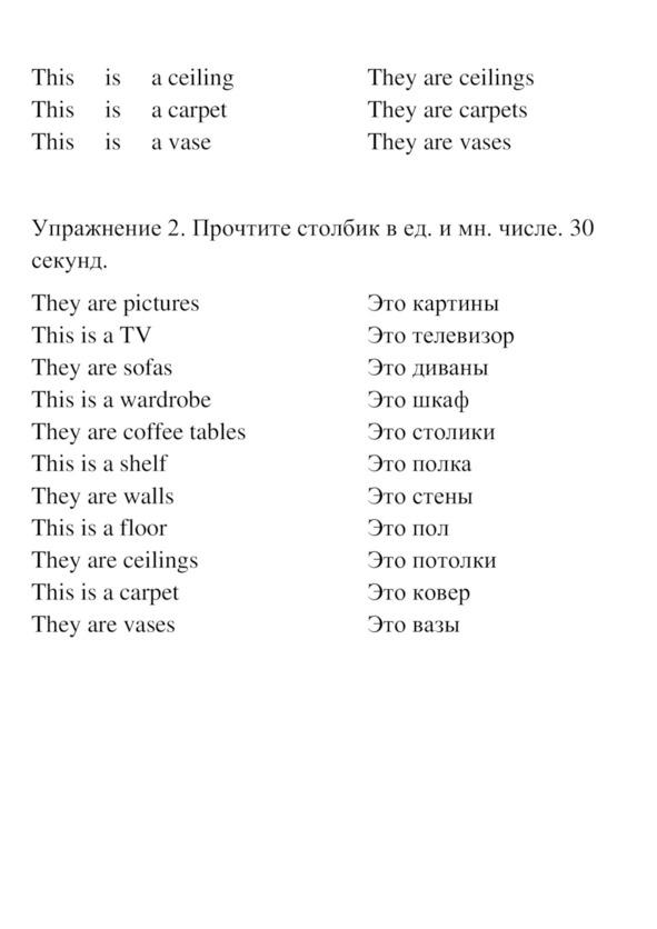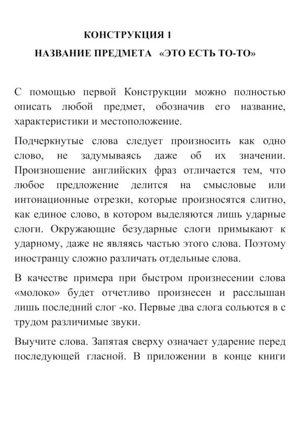 Одновременно с изучением конструкций осваивается употребление числа, лица и временных форм в них, тренируются вопросы и отрицательные предложения. Для каждой конструкции вначале идут упражнения по образцу на скорость произнесения временных форм во всех лицах и числах. Рекомендуемое время произнесения каждого упражнения замерялось на практических занятиях со студентами. В занятиях по изучению конструкций прилагаются правила и упражнения для ввода в речь местоимений, числительных, предлогов, артиклей и других частей речи.