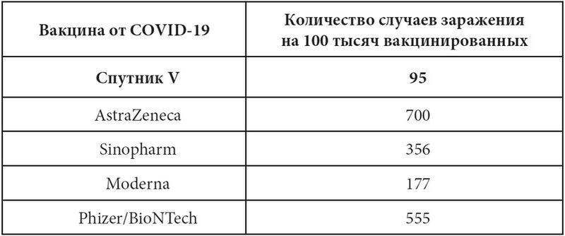 Интересные сравнительные данные получены в Венгрии. Там для вакцинации населения использовали пять наиболее известных в мире вакцин от коронавируса COVID-19, и «Спутник V» показал наибольшую эффективность с большим отрывом от конкурентов. На конец апреля 2021 года были зафиксированы следующие результаты[3]: