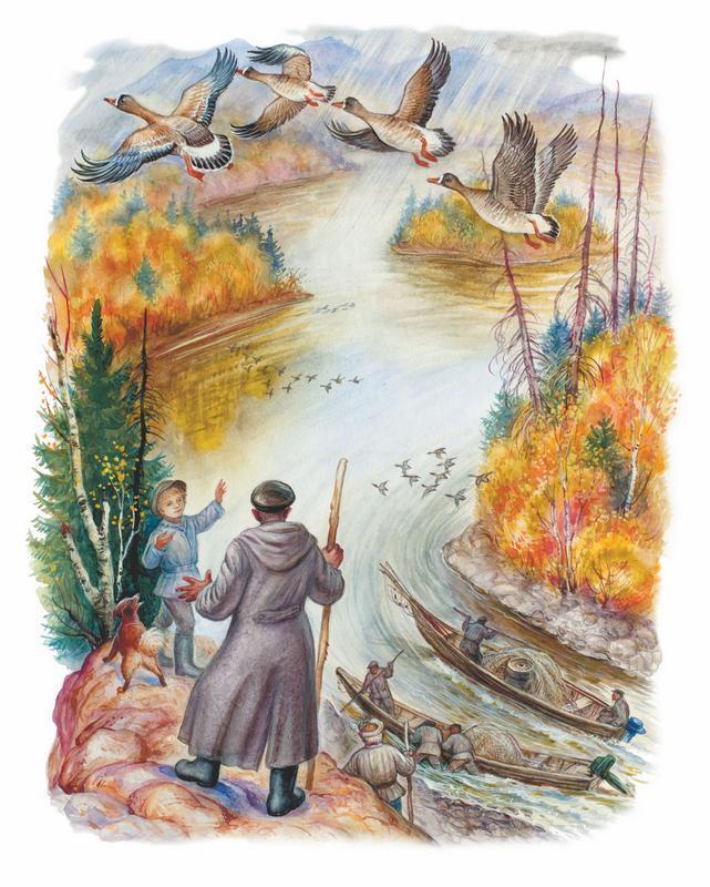 – Не́ту нам ны́нче фа́рту, – ворча́л Васю́ткин де́душка Афана́сий. – Оскуде́л ба́тюшко Енисе́й. Ра́ньше жи́ли, как бог прика́жет, и ры́ба ту́чами ходи́ла. А тепе́рь парохо́ды да мото́рки всю жи́вность распуга́ли. Придёт вре́мя – ерши́ да пескари́ и те переведу́тся, а об о́муле, сте́рляди и осётре то́лько в кни́жках бу́дут чита́ть.