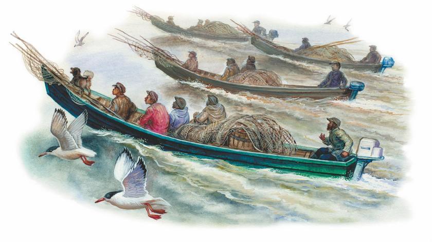 Холо́дная и́зморозь и тёмные во́лны на реке́ нагоня́ли тоску́. Не хоте́лось да́же выходи́ть на у́лицу, не то что выплыва́ть на́ реку. Заспали́сь рыбаки́, рассолоде́ли[1] от безде́лья, да́же шути́ть переста́ли. Но вот поду́л с ю́га тёплый ве́тер и то́чно разгла́дил ли́ца люде́й. Заскользи́ли по реке́ ло́дки с упру́гими паруса́ми. Ни́же и ни́же по Енисе́ю спуска́лась брига́да. Но уло́вы по-пре́жнему бы́ли малы́.