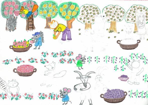 В этом лесу жили разные звери. Одни выращивали ягоды, другие собирали орехи с деревьев, третьи яблоки в больших садах.