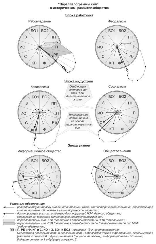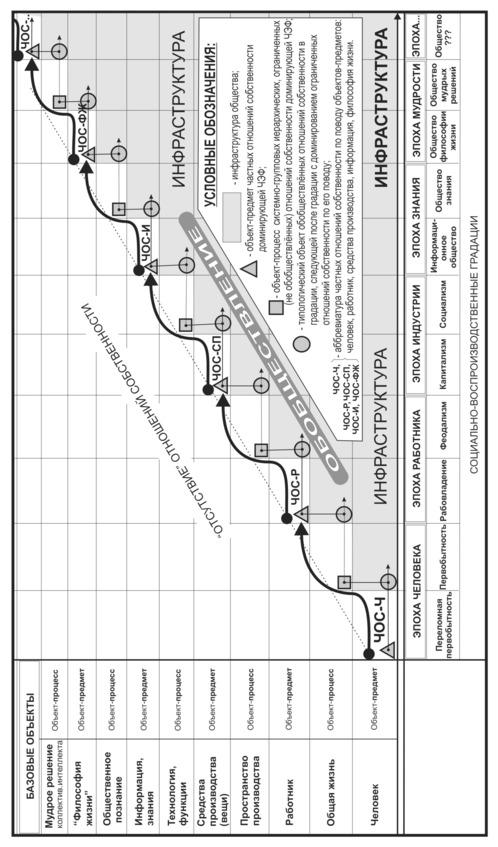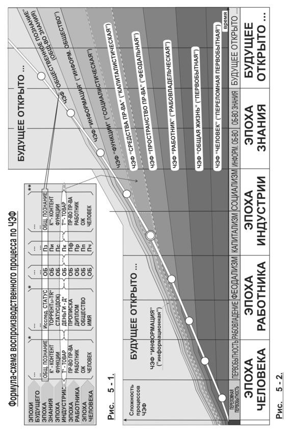 Таким образом, возвращаясь к схеме рисунка 5—2, восходящая последовательность градаций как композиций ЧЭФ может быть представлена следующим рядом вертикальных фрагментов (столбцов) этого общего отображения процессов производства и воспроизводства действительной жизни: переломная первобытность, первобытность, рабовладение, феодализм, капитализм, социализм, информационное общество, общество знания и т. д. Эти фрагменты-композиции напоминают многослойные пирожные со «стандартным» набором слоёв ЧЭФ, объёмный образ которых напоминает геодинамическую тектонику литосферных плит, но уже в понятиях восходящего эндогенного социально-воспроизводственного развития социума и его будущего.