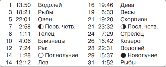 Ингрессии Луны (время вхождения Луны в зодиакальные созвездия), время новолуний и полнолуний, летнего и зимнего солнцестояния, весеннего и осеннего равноденствия, восхода и заката Солнца и Луны даны для часового пояса и географических координат Москвы (55°45 N, 37°42 E).